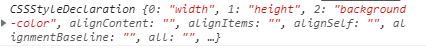 console.log(div.style); // CSSStyleDeclaration {0: "width", 1: "height", 2: "background-color", alignContent: "", alignItems: "", alignSelf: "", alignmentBaseline: "", all: "", …}